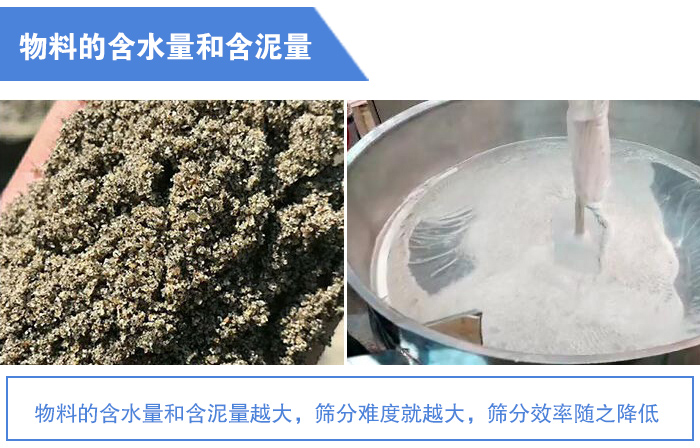 如果物料中包含的表面水分在一定程度內(nèi)增加,那它的粘滯性就會(huì)增大,造成細(xì)?;ハ嗾辰Y(jié)成團(tuán),并附著在大顆粒上;同時(shí)還有物料中包含的粘性物質(zhì),很容易把篩孔堵住。這些都大大降低了篩分效率。