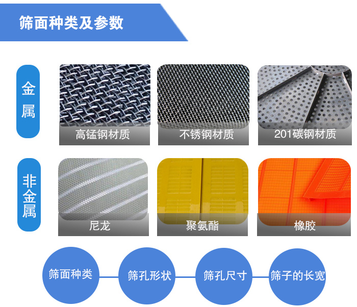 篩子的工作面通常有三種,鋼棒制造的、鋼絲編織的和鋼板沖孔的。它們對篩分效率的影響主要和它們的有效面積有關(guān),有效面積愈大的篩面,篩孔占的面積愈多,礦粒就更容易透過篩孔,這樣篩分效率就會(huì)變高,但相對的篩面壽命會(huì)較短。因此選擇篩面要根據(jù)實(shí)際情況。