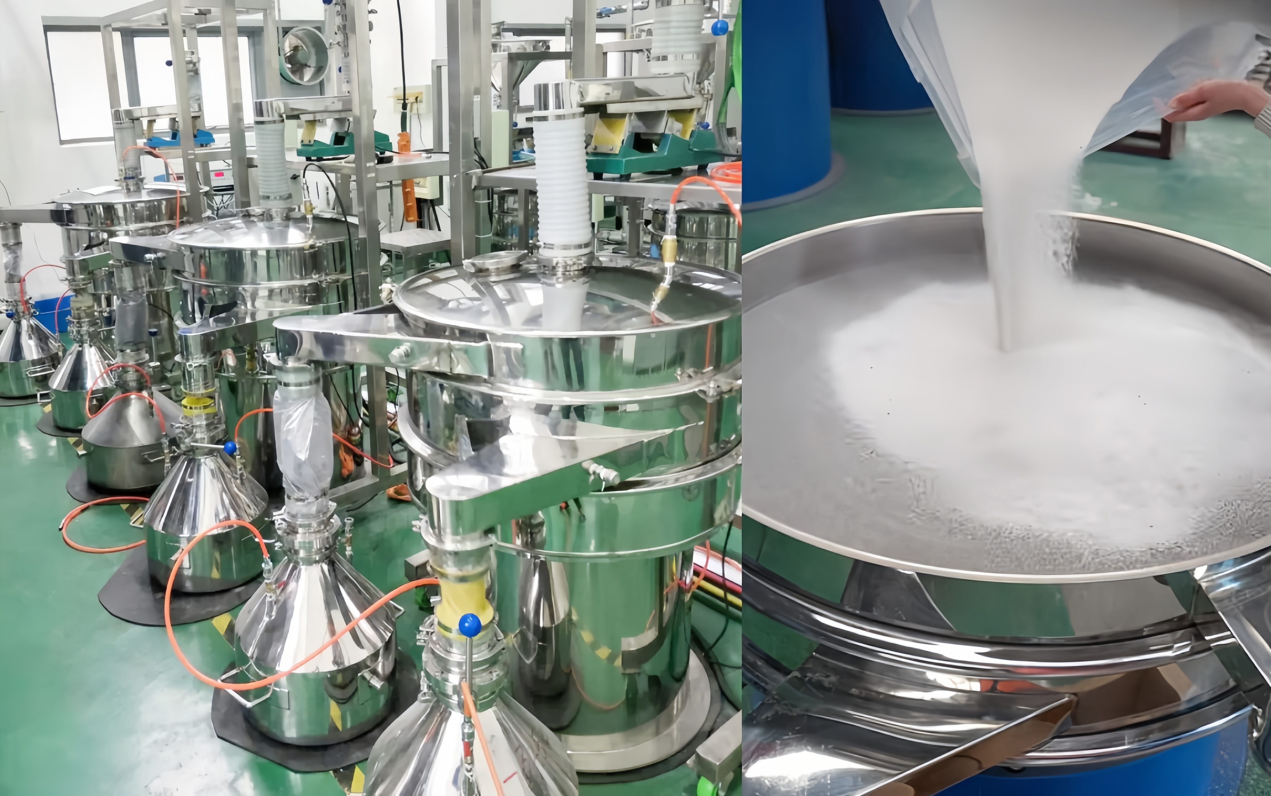 搖擺篩:采用低頻仿人工三維平旋搖擺運動,通過可調偏心機構,使物料在篩面走出漸開螺旋線軌跡,從中心向外緣緩慢擴散。該機型運動柔和,不會破壞氫氧化鈉物料形態,適合易碎、易團聚的氫氧化鈉粉體篩分,支持加裝超聲波系統,能夠應對超細粉末的篩分。