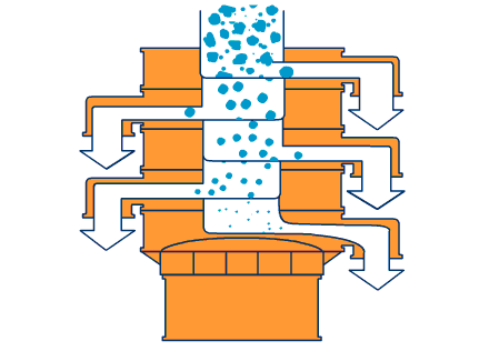 DH-600-3S型篩分機采用YZUL立式振動電機作為激振源,通過振動電機上下兩端的偏心重錘將旋轉運動轉變為水平、垂直、傾斜的三次元運動,并傳遞到篩粉機的篩面上;物料通過入料口進入設備內,根據不同物料篩分要求,物料經過1-5層采用不同目數的金屬編織篩網的篩分層,在這個過程中,位于各層的篩網下的清網裝置(彈跳球)通過頻率振動不斷撞擊篩網,使篩網上層物料能夠順暢的透網篩分,并有效解決了物料堵網問題出現,不同目數的物料通過各層對應目數的篩網后在各層的出料口排出,實現篩選除雜或過濾分級的目的。調節上、下兩端的相位角,可以改變物料在篩面上的運動軌跡。